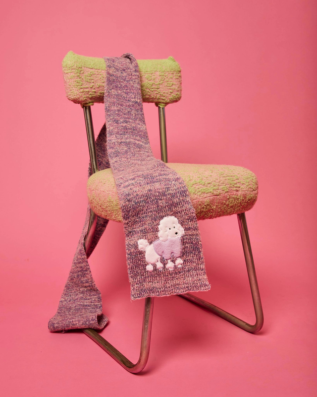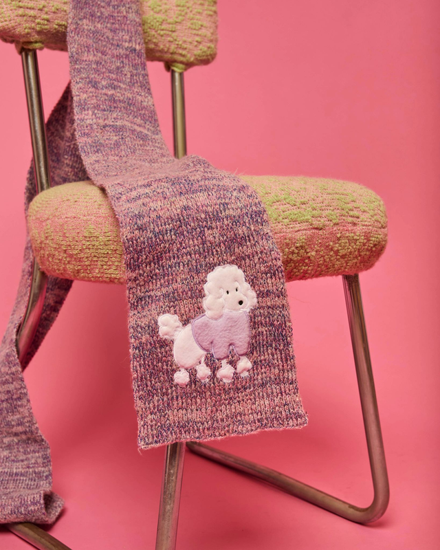 écharpe coloris chiné, fils rose de base, accompagné d'un fils fin fuchsia et d'un fils fin bleu. Orné d'un caniche brodé Thon mayo.